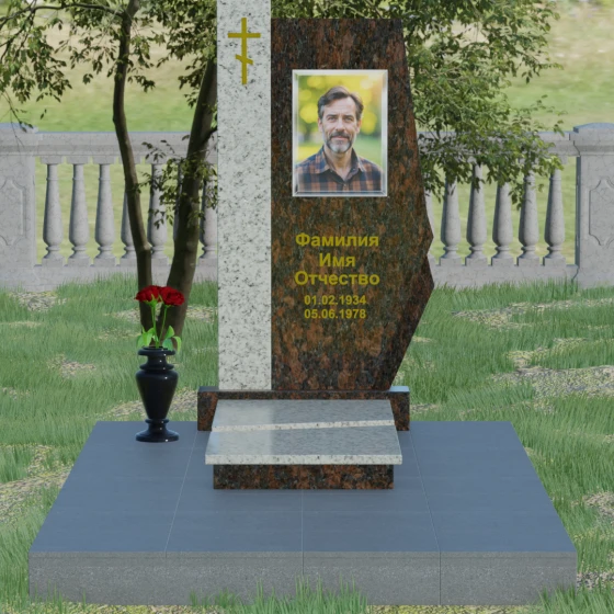 Данная мемориальная композиция — это торжество современной архитектурной мысли, воплощенное в благородном граните. Выбор этой модели обусловлен её уникальной асимметричной геометрией, которая выделяет захоронение на фоне типовых решений. Комбинированное исполнение из двух контрастных видов камня позволяет создать глубокий визуальный акцент: вертикальная колонна из насыщенного красного гранита символизирует духовную опору и жизненную энергию, в то время как основная стела из глубокого черного камня олицетворяет вечный покой и скорбь. Надгробие из натурального камня такой формы выглядит монументально и одновременно изящно благодаря сложной огранке. Правая грань основной стелы дополнена характерным скосом и ступенчатым вырезом, что придает изделию динамику и многогранность. Особое внимание уделено игре света и тени на полированных поверхностях: зеркальный блеск черного гранита отражает небо, создавая эффект глубины, а матовые фаски подчеркивают строгость и чистоту линий архитектурного ансамбля.