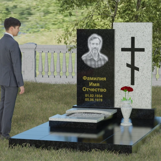 Кому подойдет: Эта модель является универсальным решением для тех, кто ищет баланс между традициями и современным дизайном. В строгом контрастном исполнении (черный и белый гранит) мемориал станет достойным памятником отцу, мужу, брату или дедушке, подчеркивая их мужество и твердость. При выборе более мягких оттенков, таких как мрамор Тассо или гранит Блю Перл, композиция приобретает нежность и светлую грусть, идеально подходя для оформления захоронения матери, жены или дочери. Это выбор людей, стремящихся выразить свою глубокую скорбь через благородную эстетику камня, которая останется неизменной для многих поколений потомков.