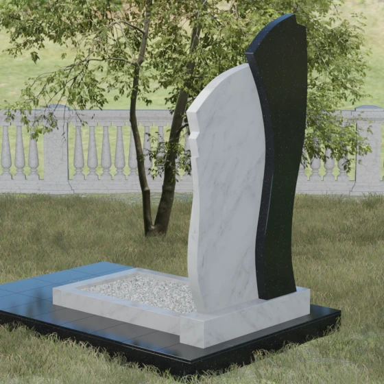 Данное ритуальное изделие представляет собой сложную художественную композицию, в которой мастерски обыгран контраст форм и материалов. В центре внимания — двухсоставная стела, объединяющая в себе мягкость восходящей линии и решительную геометрию скалы. Левый сегмент выполнен в виде изящной, тянущейся к небу волны из светлого камня, на которой лаконично расположился золоченый православный крест. Правая часть, служащая основанием для портрета, притягивает взгляд своей необычной обработкой: её внешний торец выполнен с каскадной, ступенчатой резкой, создающей эффект многослойности и глубины. Такая асимметрия символизирует сложность жизненного пути и возвышенность души.