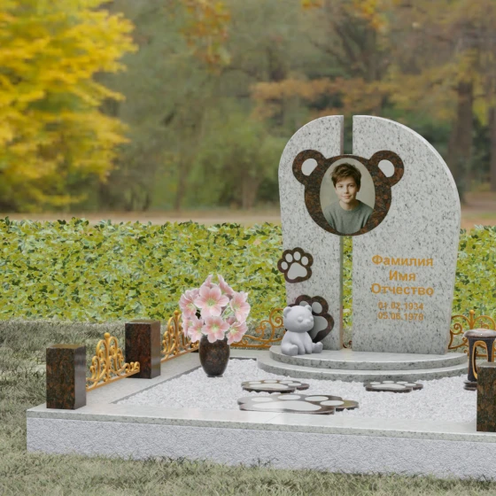 Композиция данного мемориала поражает своей уникальной архитектурой. Центральное вертикальное полотно разделено на две симметричные части узким вертикальным просветом, что создает ощущение легкости и устремленности ввысь, несмотря на внушительный вес камня. Главным художественным акцентом является медальон в верхней части, выполненный в виде стилизованной головы медвежонка. Портрет обрамлен светлой вставкой из благородного гранита, которая выступает над основной плоскостью, создавая эффект мягкого свечения вокруг лика.