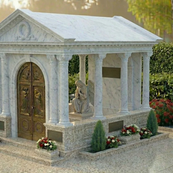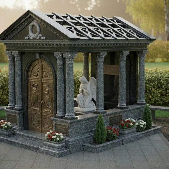 Представляем вашему вниманию величественную стелу – монументальный мемориальный комплекс ПН 043, который является не просто памятником, а настоящим произведением искусства, воплощающим глубокое уважение и вечную память. Этот архитектурный шедевр выполнен в форме изящного мавзолея с открытой крышей, создающей ощущение возвышенности и стремления к небесам. Строгие, но при этом гармоничные линии классической архитектуры, с колоннами и фронтоном, придают комплексу неподвластную времени элегантность. Центральное место занимает величественная стела, выполненная из темного, глубоко полированного камня, который словно зеркало отражает свет, символизируя чистоту и ясность воспоминаний. На этой стеле, расположенной внутри мавзолея, предусмотрено идеальное пространство для гравировки портрета и памятных слов, которые будут увековечены с особой торжественностью. Рядом с ней, в скорбной позе, застыла фигура ангела, вырезанная из светлого мрамора. Ее нежные, плавные линии и объемные складки одеяния создают трогательный контраст с полированной поверхностью стелы, добавляя композиции глубины и эмоциональности. Каждая деталь резьбы, будь то изысканный венок на фронтоне или тонкие узоры на дверях, выполнены с поразительной точностью и мастерством, подчеркивая уникальность и достоинство этого монумента.
