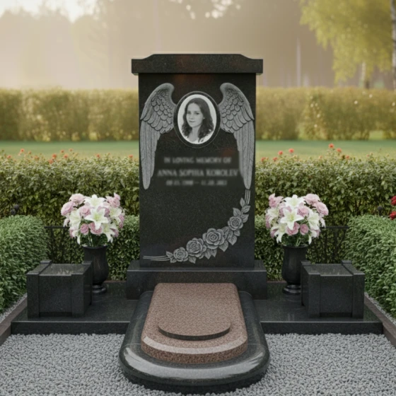 Особое внимание привлекает художественное оформление стелы. В верхней части выгравированы изящные, детально проработанные крылья ангела, обрамляющие овальный медальон для портрета. Каждое перо этих крыльев выполнено с удивительной точностью, создавая ощущение легкости и воздушности, символизируя вознесение души и ее вечный покой. Ниже, в левой части стелы, расположена гравировка в виде пышного букета роз, спускающегося каскадом. Лепестки каждой розы прорисованы с невероятной тщательностью, передавая их объем и нежность. Матовая фактура резьбы на фоне глубокого черного полированного камня создает выразительный контраст, который придает изображению живость и реалистичность. Розы, как символ любви и скорби, здесь представлены в своем наивысшем расцвете, что говорит о вечной памяти и неувядающей привязанности.
