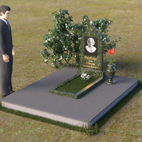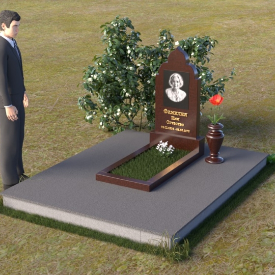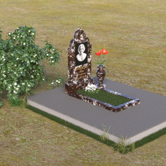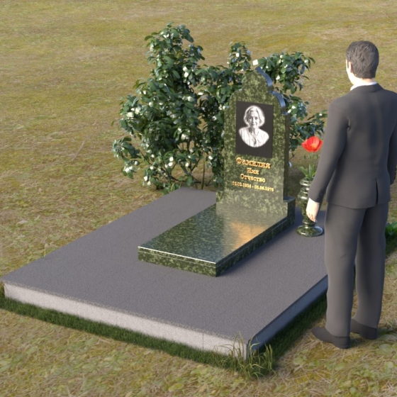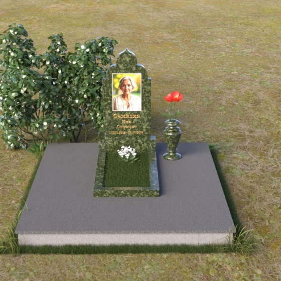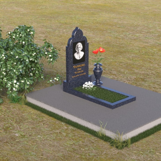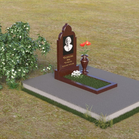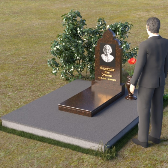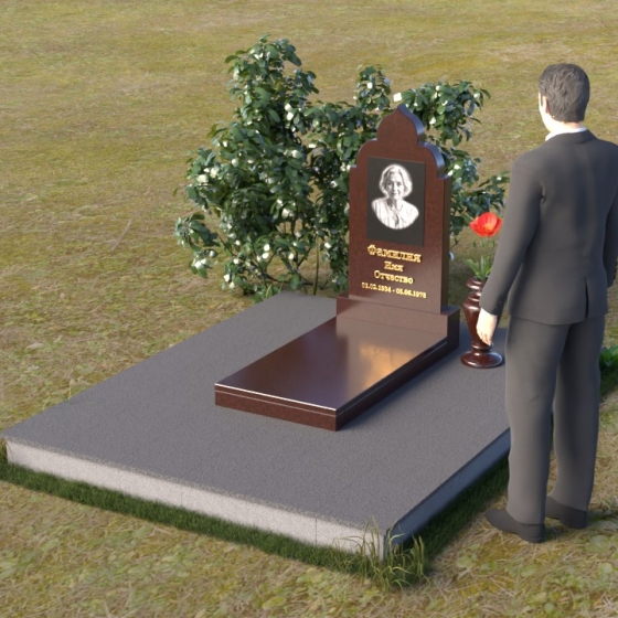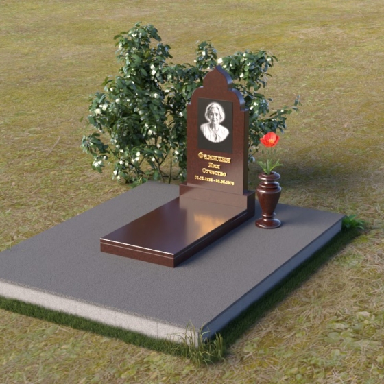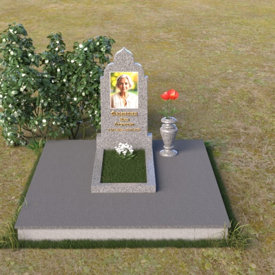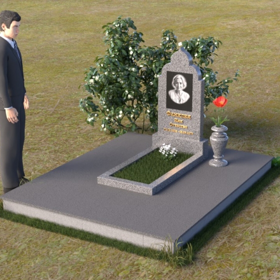 Основание композиции – прямоугольная плита с ровной, матовой поверхностью, обеспечивающая надежную устойчивость всей конструкции. На ней располагается горизонтальная плита, выполненная в виде усеченного параллелепипеда с зеркально отполированной поверхностью. Эта плита создает эффект глубины и отражает окружающий мир, словно запечатлевая моменты жизни ушедшего. Вертикальная стела возвышается над горизонтальной плитой, ее верхняя часть выполнена в форме изящной арки с плавными изгибами. Арка завершается небольшим декоративным элементом, напоминающим купол, что придает памятнику особую выразительность и духовность.