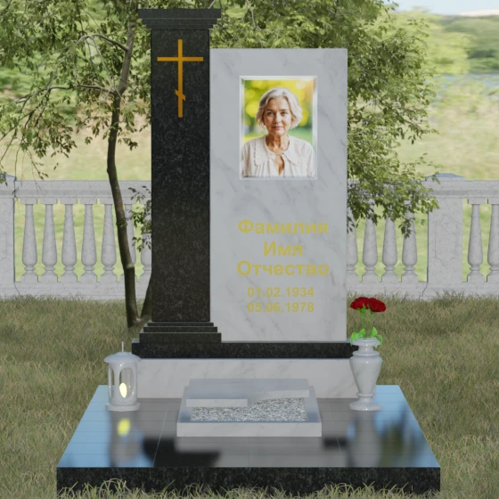 Композиция данного надгробия построена на гармоничном сочетании двух вертикальных элементов, установленных на массивное ступенчатое основание. Левая часть выполнена в виде величественной колонны с декоративным навершием в классическом стиле. На фронтальной стороне колонны расположена гравировка православного креста, покрытая сусальным золотом или имитирующим его составом, что придает мемориалу торжественный и одухотворенный вид. Правая часть — это лаконичная прямоугольная стела, предназначенная для размещения портрета и памятных надписей. Строгая геометрия линий подчеркивает внутреннюю силу и достоинство того, чья память здесь увековечена.