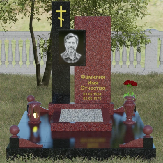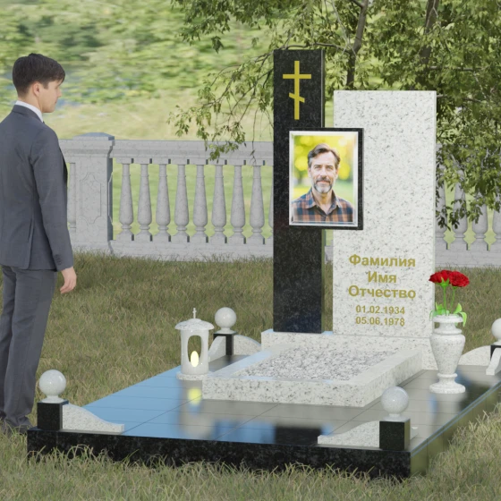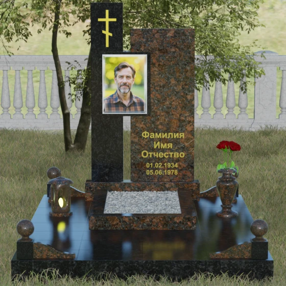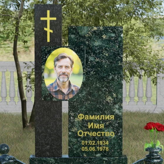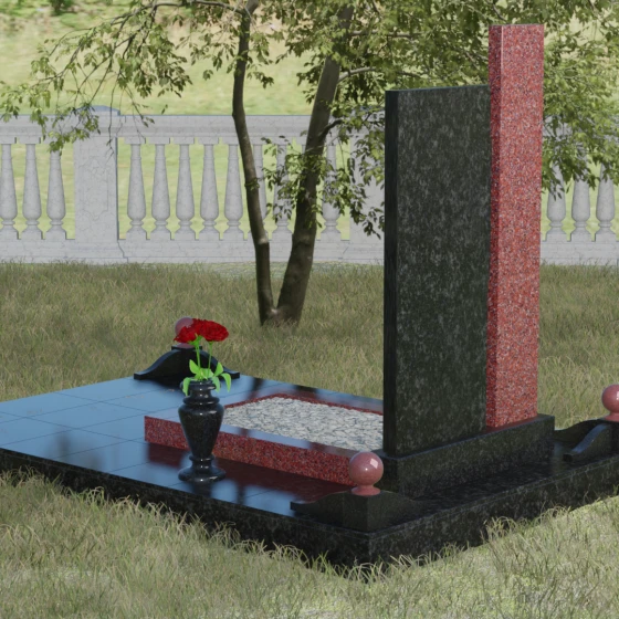 Данное ритуальное изделие представляет собой подлинный образец современного мемориального искусства, в котором строгость архитектурных форм гармонично сочетается с глубоким философским подтекстом. Композиция выстроена на изящном сопоставлении двух вертикальных стел, имеющих разную высоту и фактуру. Асимметричное исполнение символизирует многогранность человеческой жизни: её взлеты и земное завершение. Высокая зеркально-черная стела воплощает собой бесконечность космоса и тишину вечного сна, в то время как примыкающий к ней цветной элемент из благородного камня привносит в ансамбль теплоту земных воспоминаний. Плавные переходы между гранями и безупречная полировка создают ощущение текучести времени, которое застыло в камне, оберегая вечный покой усопшего.