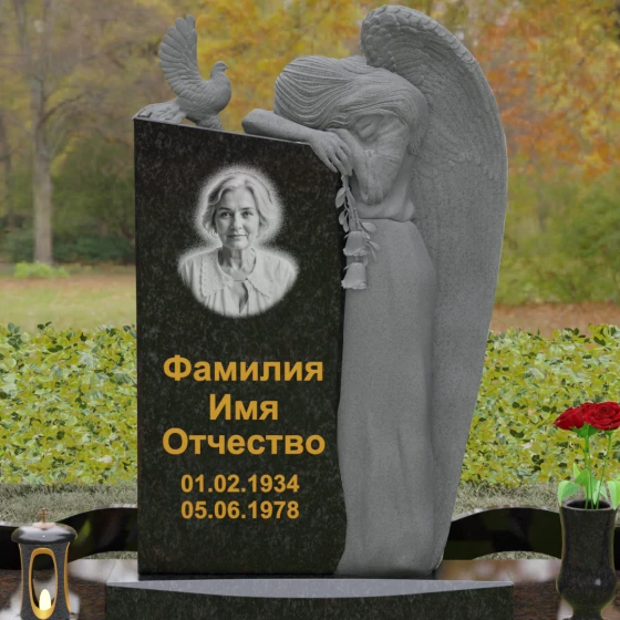 Представленный мемориальный ансамбль (Артикул 129) — это не просто памятный знак, а глубокое архитектурное высказывание, в котором застывшая в камне скорбь обретает форму высокого искусства. Величественная стела доминирует в композиции, представляя собой сложный симбиоз строгой геометрии и филигранной художественной резьбы. Центральным элементом является объемная фигура скорбящего ангела, выполненная в технике глубокого барельефа. Мастерски переданная пластика крыльев с детальной проработкой каждого перышка создает ощущение мягкости, которая парадоксальным образом контрастирует с твердостью натурального камня. Склоненный лик ангела и тонкие складки его одеяний, выполненные в матовом срезе, эффектно выделяются на фоне зеркально полированной поверхности основной плиты. В руках небесного покровителя застыла роза — символ вечной любви, чьи лепестки проработаны с исключительным вниманием к объему и естественности линий.