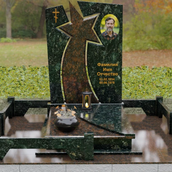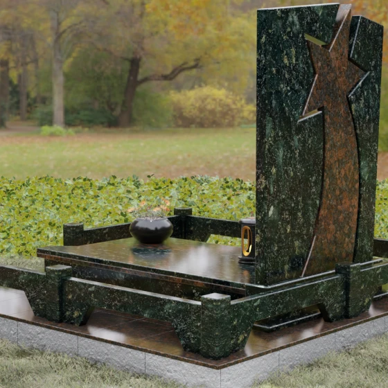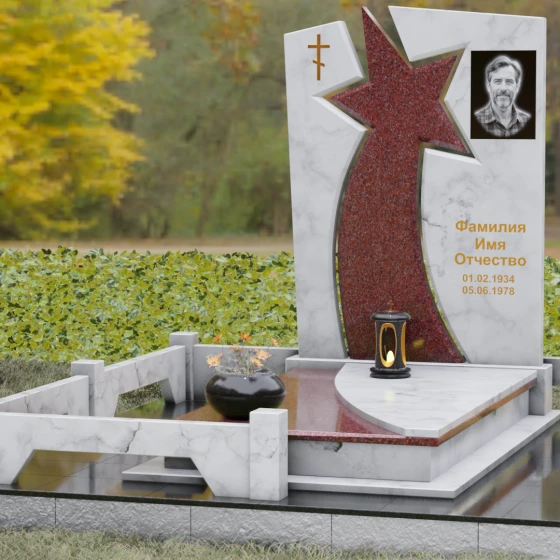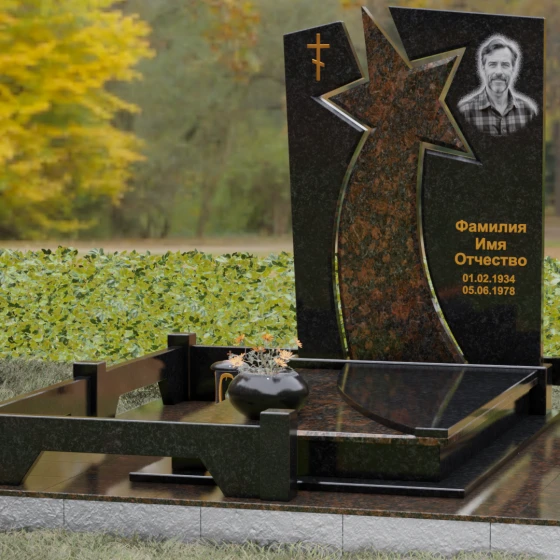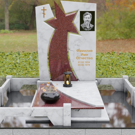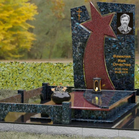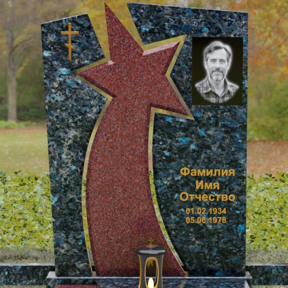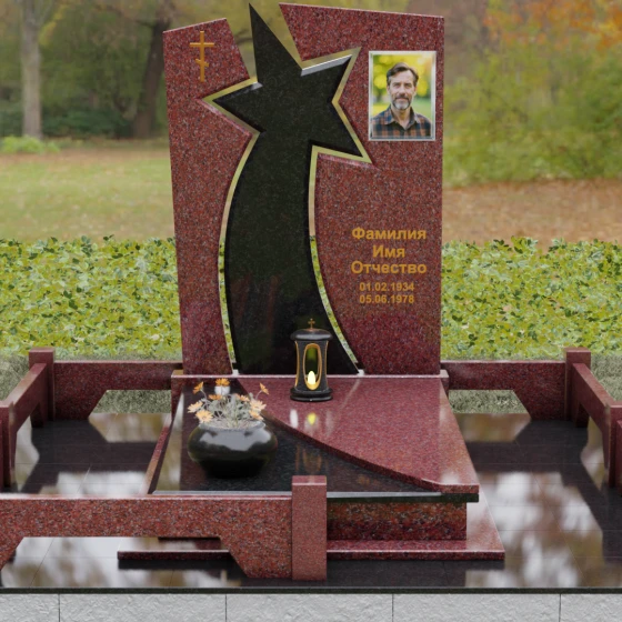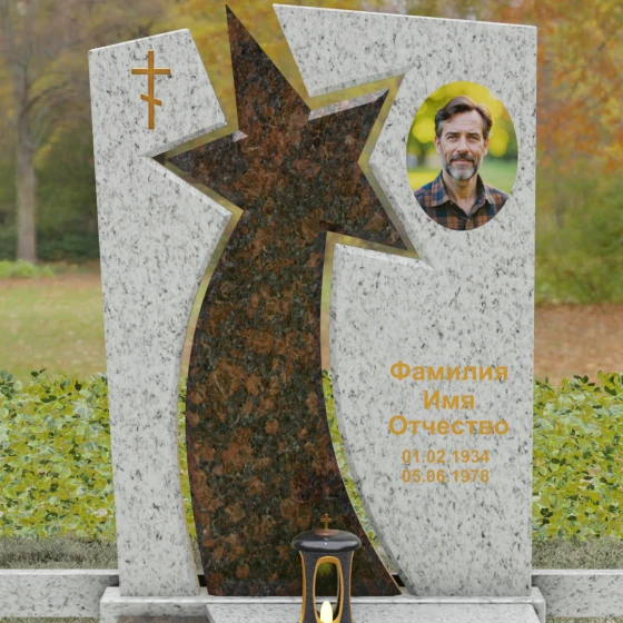Форма этого мемориала наполнена глубокими смыслами. Центральный символ — звезда — традиционно олицетворяет путеводный свет, высокие достижения и бессмертие души. Для тех, чья жизнь была связана со служением отечеству, этот элемент подчеркивает их доблесть и профессиональный путь. В сочетании с православным крестом композиция говорит о единстве земного подвига и духовного упокоения. Плавные, дугообразные линии, обрамляющие центральную вставку, символизируют непрерывность времени и защиту, которую обретает душа в вечности. Асимметричная верхушка стелы подчеркивает индивидуальность и неповторимость жизненного пути человека.