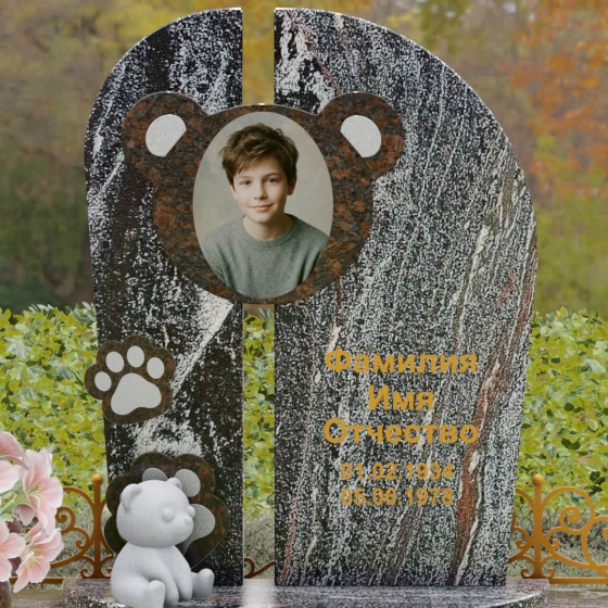 Композиция данного мемориала поражает своей уникальной архитектурой. Центральное вертикальное полотно разделено на две симметричные части узким вертикальным просветом, что создает ощущение легкости и устремленности ввысь, несмотря на внушительный вес камня. Главным художественным акцентом является медальон в верхней части, выполненный в виде стилизованной головы медвежонка. Портрет обрамлен светлой вставкой из благородного гранита, которая выступает над основной плоскостью, создавая эффект мягкого свечения вокруг лика.