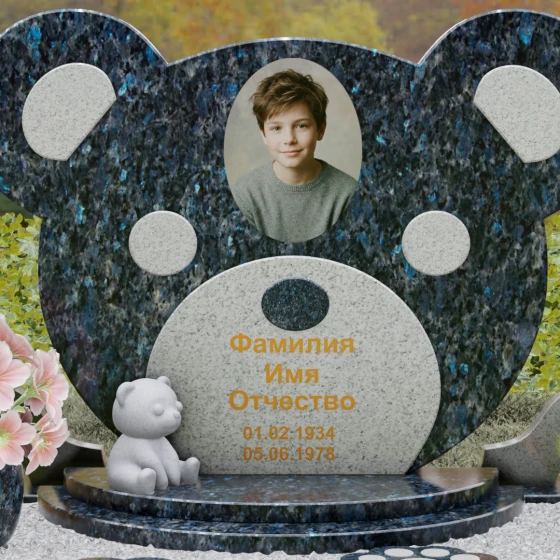Эта мемориальная композиция представляет собой уникальный художественный проект, созданный для того, чтобы выразить бесконечную нежность и светлую печаль. Главная стела выполнена в форме головы медвежонка — символа чистоты, детства и вечного сна. Плавные, округлые линии силуэта лишены острых углов, что придает изделию визуальную мягкость и умиротворение. Мастера-камнерезы виртуозно передали геометрию образа: симметричные ушки со светлыми вставками и выразительные круглые глаза, созданные методом инкрустации камня другого оттенка. Игра контрастов между глубоким темным основанием и светлым матовым срезом декоративных элементов создает эффект живого объема, заставляя свет играть на полированных гранях и подчеркивая безупречную пластику камня.