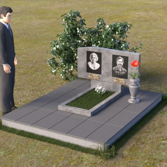 Основным элементом композиции является вертикальная плита, возвышающаяся над прямоугольным основанием. Гранитная плита имеет слегка вогнутую форму верхней грани, что придает ей мягкость и визуально облегчает массивность. На отполированной до зеркального блеска поверхности выгравированы портреты усопших, выполненные с высокой степенью детализации. Под портретами располагаются надписи с именами и датами жизни, выполненные строгим шрифтом. Вся композиция пронизана чувством сдержанности и достоинства, что позволяет сосредоточиться на главном – на памяти о тех, кого больше нет рядом.