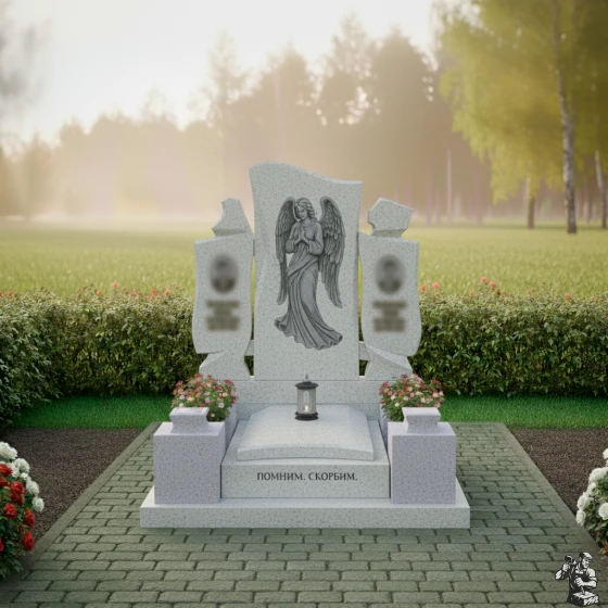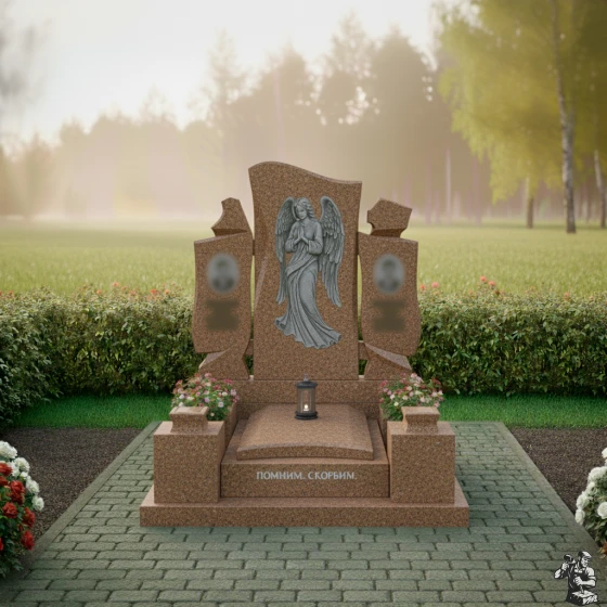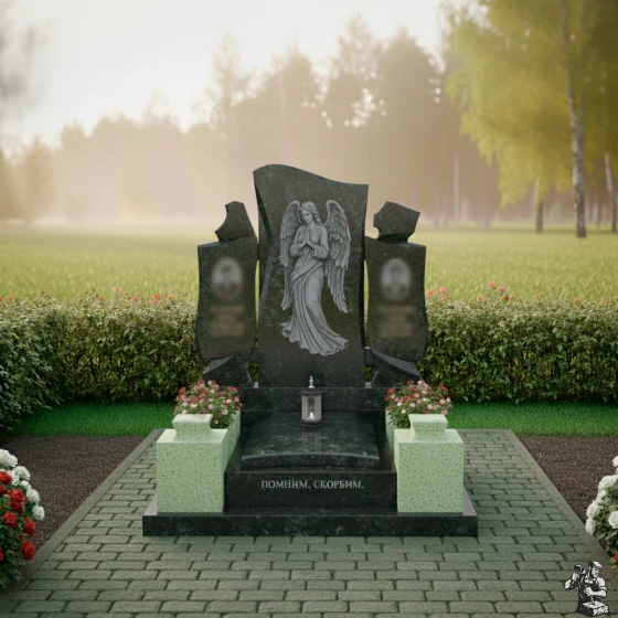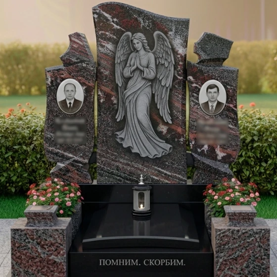 Особое внимание привлекает искусно выполненная резьба на центральной части монумента. Здесь изображен ангел с опущенными крыльями, склонивший голову в молитве или глубокой скорби. Каждая деталь его одеяния, каждая складка ткани, каждое перо на крыльях проработаны с невероятной точностью. Матовая фактура резьбы контрастирует с зеркальной полировкой основного камня, создавая потрясающую игру света и тени, которая придает изображению объем и глубину. Кажется, что ангел вот-вот оживет, наполняя пространство тихим утешением. Справа и слева от центрального изображения ангела, на боковых элементах, расположены две вставки овальной формы, предназначенные для портретов усопших, их матовая поверхность мягко выделяется на фоне глянцевого камня, создавая гармоничный акцент.