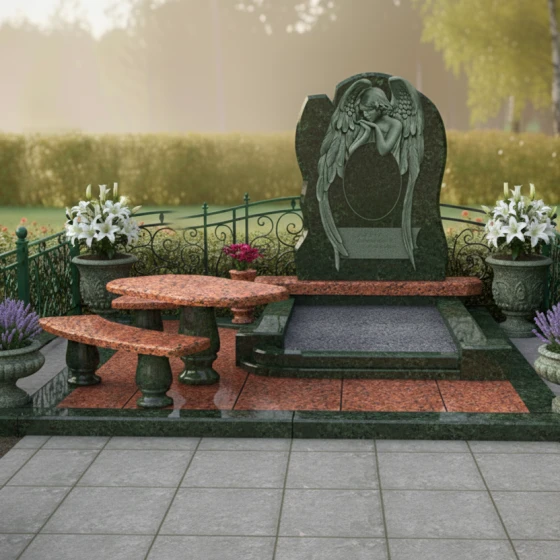 Форма стелы с ее арочным силуэтом и центральным резным изображением скорбящего ангела предоставляет широкие возможности для размещения портрета усопшего. Наиболее гармонично портрет будет смотреться в верхней части стелы, над фигурой ангела, или же в центральной части, если изображение ангела будет смещено вниз или выполнено в виде барельефа. Зеркальная полировка поверхности идеально подходит для высококачественной гравировки портрета и эпитафии, обеспечивая четкость линий и долговечность изображения. Благодаря гладкой поверхности камня, портрет будет выглядеть максимально выразительно, а отражающая способность полировки придаст ему особую глубину и объем. Выбор шрифта для эпитафии также играет важную роль: классические, строгие шрифты подчеркнут серьезность и торжественность момента, в то время как более изящные и каллиграфические могут добавить нотку индивидуальности. Этот мемориальный комплекс — это не просто камень, это архитектурное произведение, призванное сохранить светлую память о человеке и стать местом утешения для близких. Он станет вечным свидетельством любви и уважения, воплощенным в прочном и прекрасном материале.