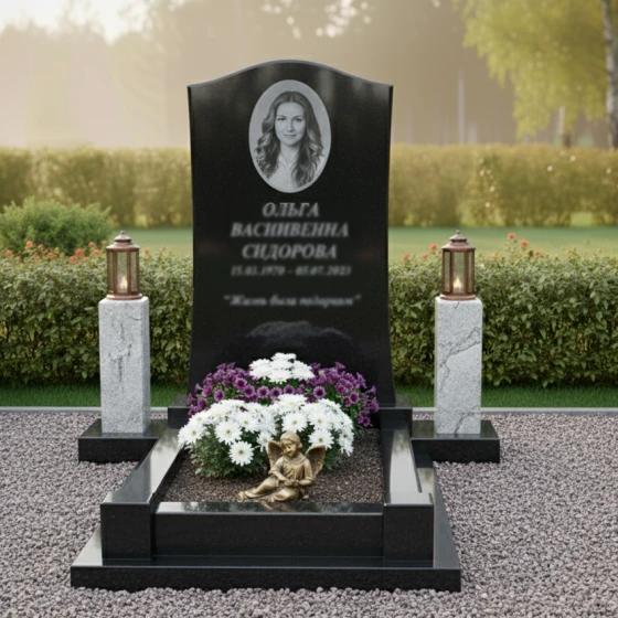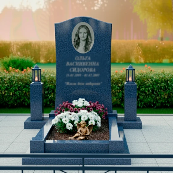 Особое внимание уделено благоустройству участка. Монумент установлен на прочный, низкий гранитный цоколь, который четко очерчивает границы мемориала, придавая ему завершенный и монументальный вид. Надгробная плита, выполненная из того же глубокого черного гранита, что и стела, создает единое, безупречное покрытие, которое не только эстетично, но и значительно упрощает уход за местом упокоения. По углам комплекса расположены два массивных каменных столбика из светлого гранита с выразительной фактурой, на которых установлены изящные бронзовые лампады. Эти лампады с их теплыми оттенками металла и стекла добавляют комплексу элементы торжественности и вечного света. В центре надгробной плиты находится небольшая, аккуратно оформленная клумба, где пышные белые и фиолетовые цветы создают живой акцент, символизирующий продолжение жизни и красоту. Рядом с цветами расположена небольшая фигурка спящего ангела, выполненная из бронзы, что добавляет композиции трогательности и символизма, напоминая о чистоте и невинности души.