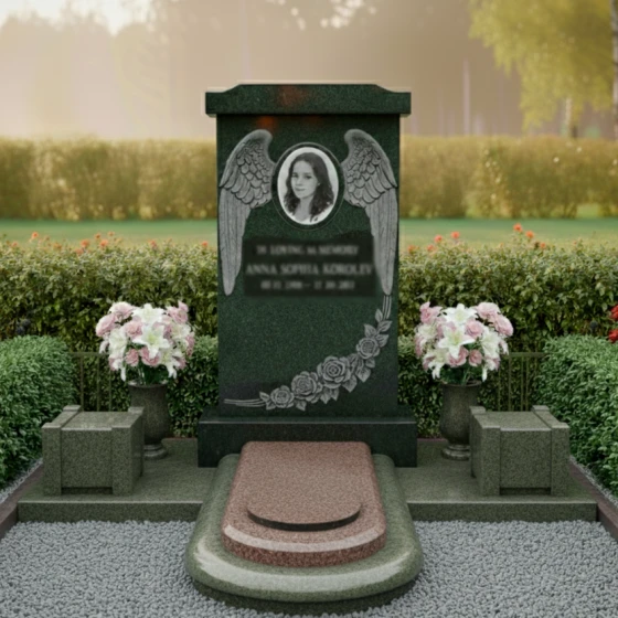 Особое внимание привлекает художественное оформление стелы. В верхней части выгравированы изящные, детально проработанные крылья ангела, обрамляющие овальный медальон для портрета. Каждое перо этих крыльев выполнено с удивительной точностью, создавая ощущение легкости и воздушности, символизируя вознесение души и ее вечный покой. Ниже, в левой части стелы, расположена гравировка в виде пышного букета роз, спускающегося каскадом. Лепестки каждой розы прорисованы с невероятной тщательностью, передавая их объем и нежность. Матовая фактура резьбы на фоне глубокого черного полированного камня создает выразительный контраст, который придает изображению живость и реалистичность. Розы, как символ любви и скорби, здесь представлены в своем наивысшем расцвете, что говорит о вечной памяти и неувядающей привязанности.