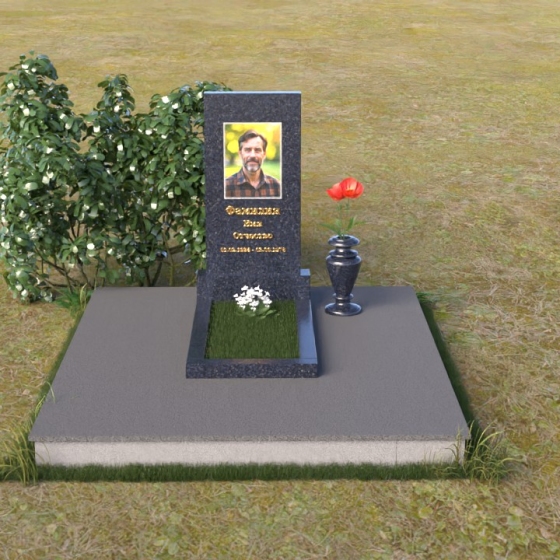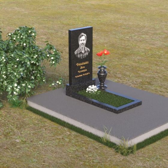 Мемориальная композиция представляет собой вертикальную стелу, выполненную в строгой прямоугольной форме, символизирующей стойкость и незыблемость памяти. Верхняя часть стелы, с ее четкими гранями, словно устремлена ввысь, к небесам, напоминая о духовной составляющей человеческой жизни. Боковые грани стелы обработаны с особой тщательностью, создавая эффект благородной сдержанности. Фаска, аккуратно снятая по периметру, придает изделию завершенный и элегантный вид. Горизонтальная плита, расположенная перед стелой, выполнена в зеркальной полировке, отражая небо и окружающий мир, символизируя продолжение жизни и связь с ушедшим.