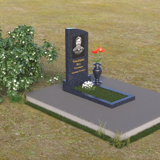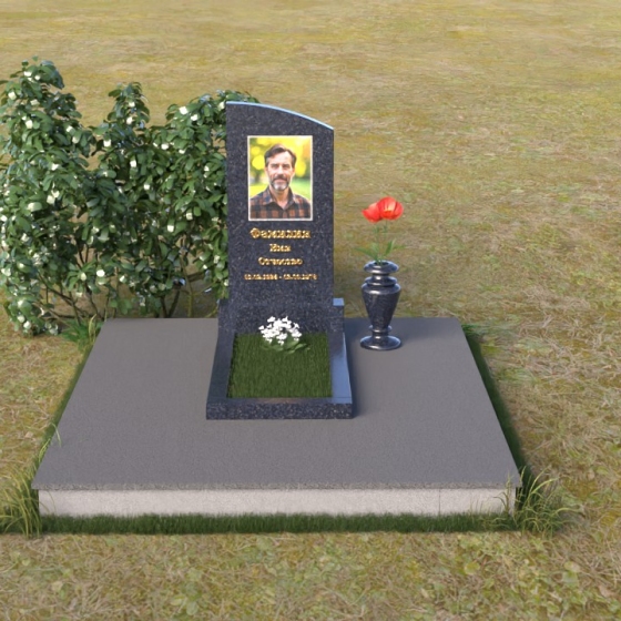 Взгляд невольно приковывает стела, выполненная в форме элегантной арки. Ее верхняя часть, скругленная мягким полумесяцем, словно устремляется ввысь, символизируя духовность и надежду. Лицевая поверхность стелы отполирована до зеркального блеска, отражая свет и создавая ощущение глубины. На ней искусно выгравирован портрет, выполненный с высокой детализацией, позволяя сохранить образ дорогого человека. Ниже располагается надпись, выполненная золотыми буквами, которые ярко выделяются на фоне черного гранита, словно светлые воспоминания, пробивающиеся сквозь время.