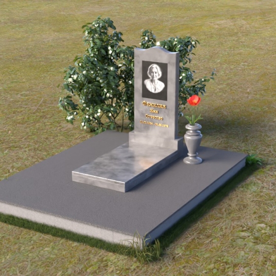 Величественная стела памятника ПВ 008 представляет собой элегантное сочетание строгих линий и плавных изгибов. Верхняя часть стелы имеет волнообразную форму, смягчающую строгость камня и придающую ей утонченность. Грани стелы тщательно отполированы до зеркального блеска, отражая свет и создавая ощущение легкости и воздушности. На лицевой стороне стелы размещен портрет усопшего, выполненный методом гравировки. Ниже располагаются надпись с именем и датами жизни. Под стелой расположена горизонтальная плита, также выполненная из полированного гранита. Ее строгие прямоугольные формы контрастируют с плавными линиями стелы, подчеркивая ее выразительность. Фаски по периметру плиты смягчают углы и придают ей завершенный вид. Рядом со стелой установлена небольшая ваза из темного гранита с изящным орнаментом, предназначенная для живых цветов.