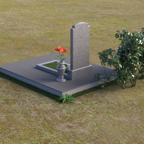 Основной акцент в этой модели сделан на контрасте фактур. Зеркальная полировка черного гранита Габбро-диабаз, из которого выполнена стела, создает эффект бесконечности, отражая небо и окружающий мир. На этом фоне особенно выразительно смотрится гравировка портрета и надписи, выполненные с ювелирной точностью. Нижняя часть стелы, переходящая в горизонтальную плиту, также выполнена из черного гранита, но уже с матовой обработкой, что придает композиции дополнительную глубину и текстуру. Рядом располагается ваза из того же гранита, выполненная в классическом стиле, предназначенная для живых цветов, которые станут символом памяти и любви.