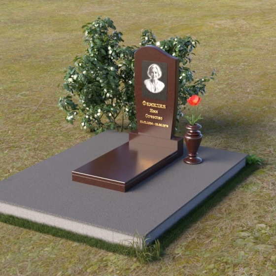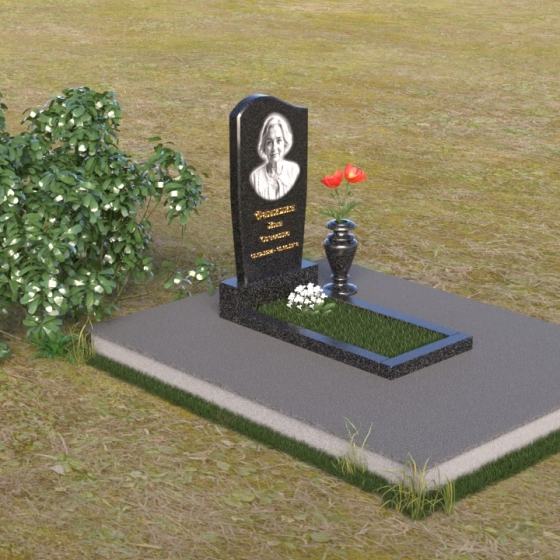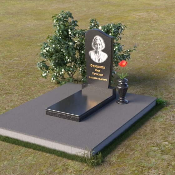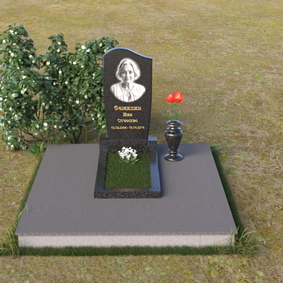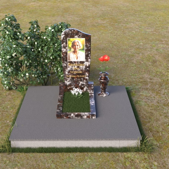 Форма стелы, тяготеющая к классической прямоугольной, предоставляет широкие возможности для персонализации. Портрет усопшего, расположенный в верхней части, будет выгодно подчеркнут лаконичной формой камня. Золотистое начертание имени и дат жизни, выполненное с особым вниманием к деталям, отчетливо выделяется на фоне полированного гранита, создавая четкий и легко читаемый текст. Дополнительно можно разместить эпитафию или памятные слова, которые отразят личность и жизненный путь ушедшего человека. Маленькая гранитная ваза, выполненная в едином стиле с мемориальной композицией, станет достойным обрамлением для живых цветов, привносящих нотку жизни и надежды.