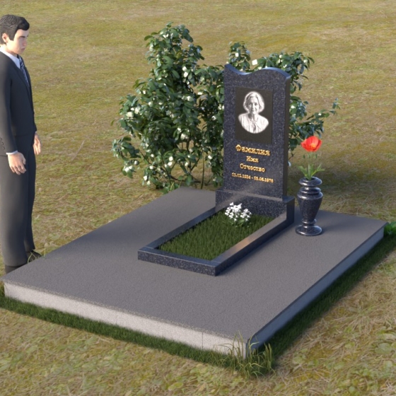 Под стелой располагается горизонтальная плита, также выполненная из полированного гранита, создающая ощущение завершенности и гармонии. Ее зеркальная поверхность отражает небо и облака, словно стирая границу между земным и небесным. Вместе стела и плита образуют единый ансамбль, который органично вписывается в ландшафт, подчеркивая красоту и умиротворение места захоронения. Черный цвет гранита символизирует скорбь и уважение, а его плотная структура гарантирует долговечность и устойчивость к любым погодным условиям. Этот памятник – достойное обрамление памяти о близком человеке, которое будет служить напоминанием о его жизни для будущих поколений.